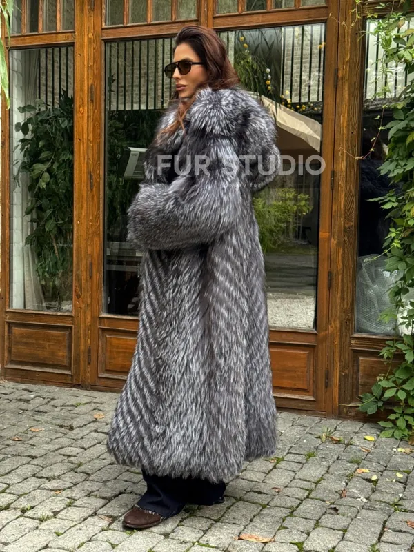 Мех данной шубы лиса, цвет серый. Предлагается в размерах от 42 до 52. Длина модели 125-130 см, что выгодно подчеркивает фигуру девушек. Эта модель идеально подойдет для девушек и женщин, предпочитающих роскошные натуральные меха.