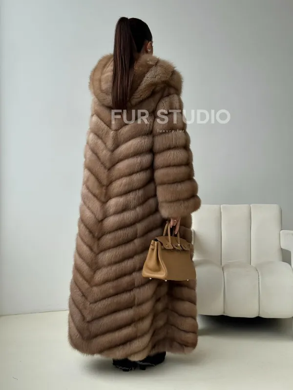 Длинная шуба из меха куницы с капюшоном 102435