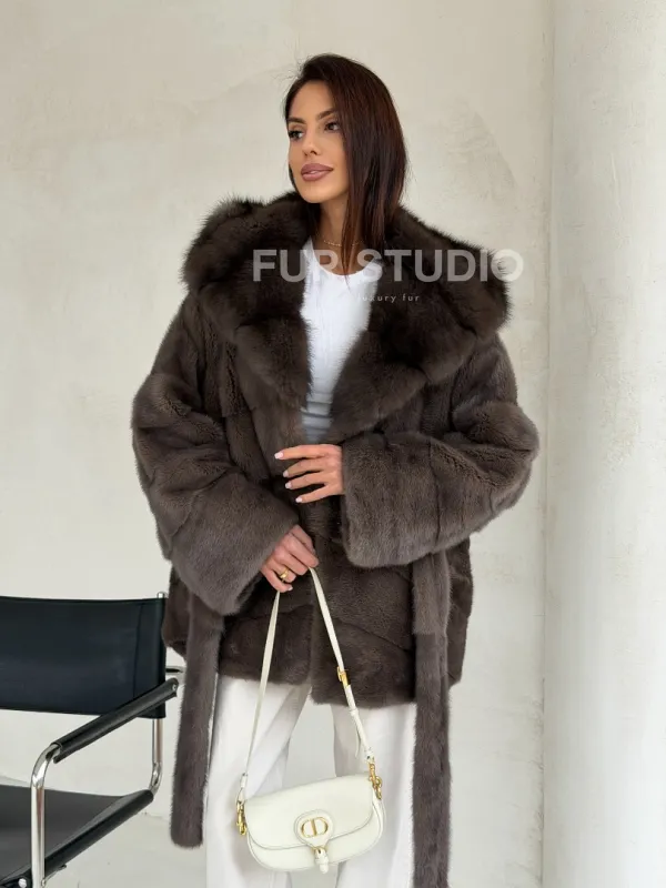 Меховой норковый полушубок с капюшоном куница 102689