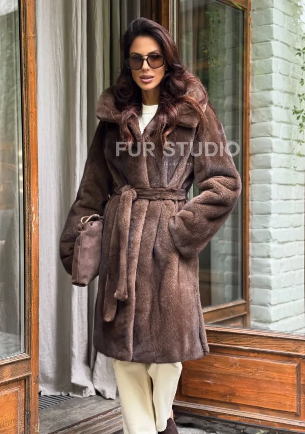 Мех данной шубы аукционная норка, цвет коричневый. Предлагается в размерах от 42 до 48. Длина модели 95-100 см, что выгодно подчеркивает фигуру девушек. Эта модель идеально подойдет для девушек и женщин, предпочитающих роскошные натуральные меха.