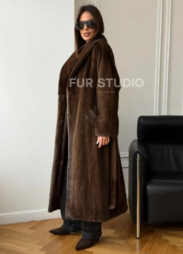 Мех данной шубы аукционная норка , цвет коричневый. Предлагается в размерах от 42 до 52. Длина модели 115-120 см, что выгодно подчеркивает фигуру девушек. Эта модель идеально подойдет для девушек и женщин, предпочитающих роскошные натуральные меха.