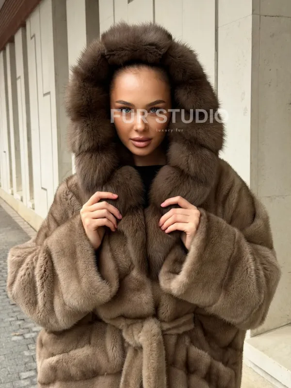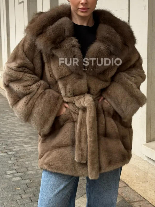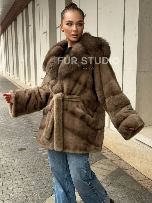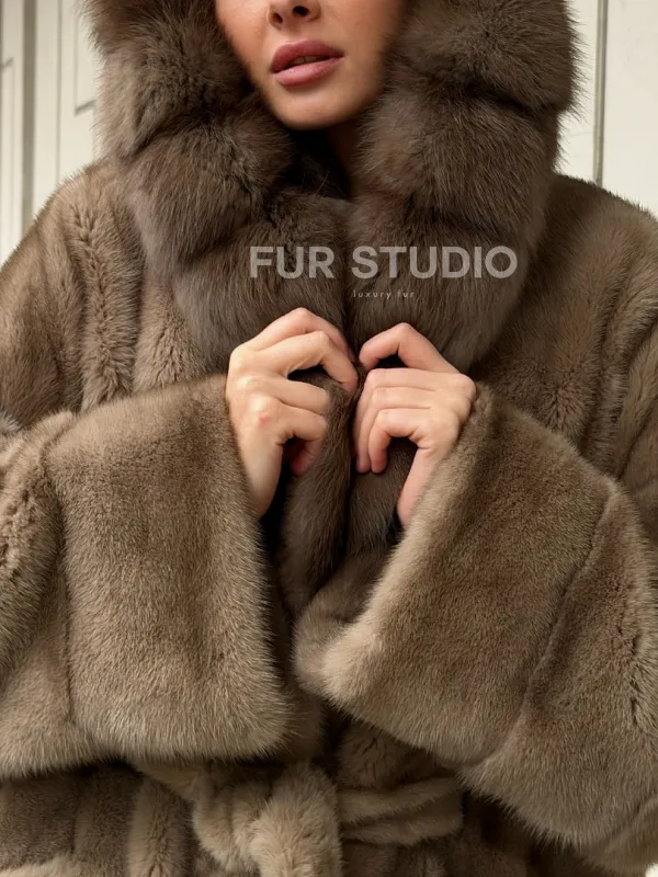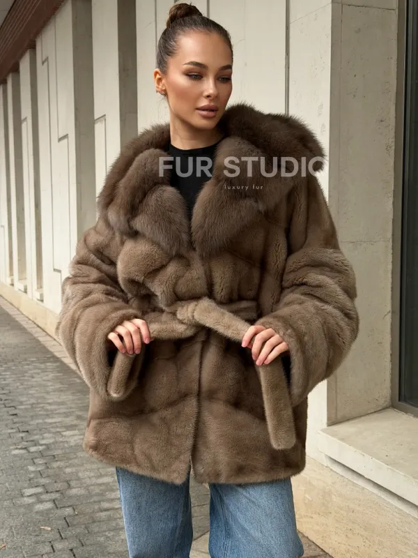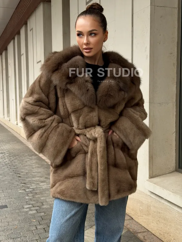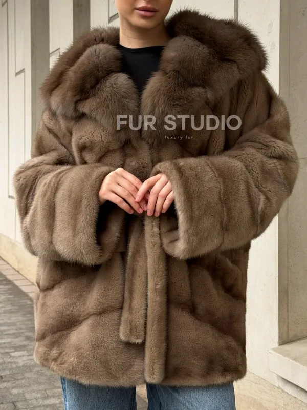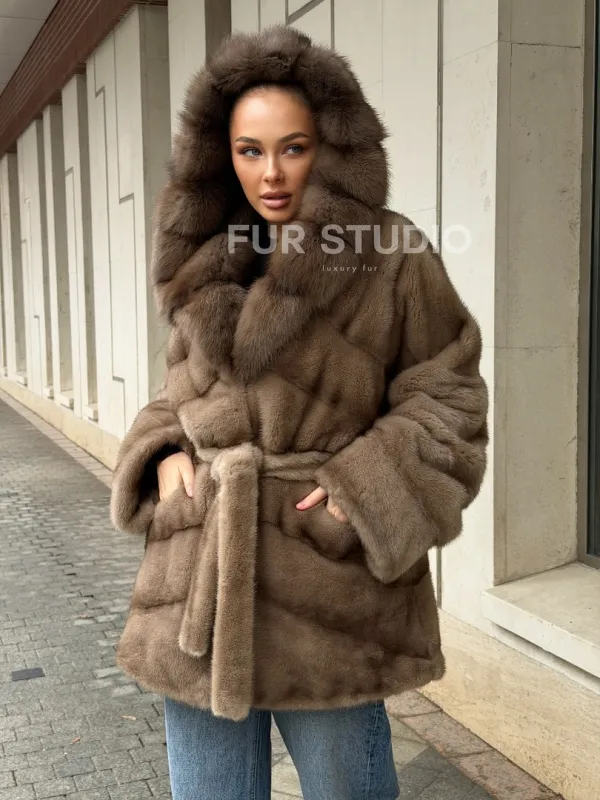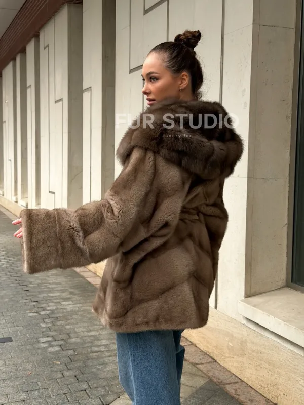 Полушубок норковый с капюшоном из меха куницы 102577