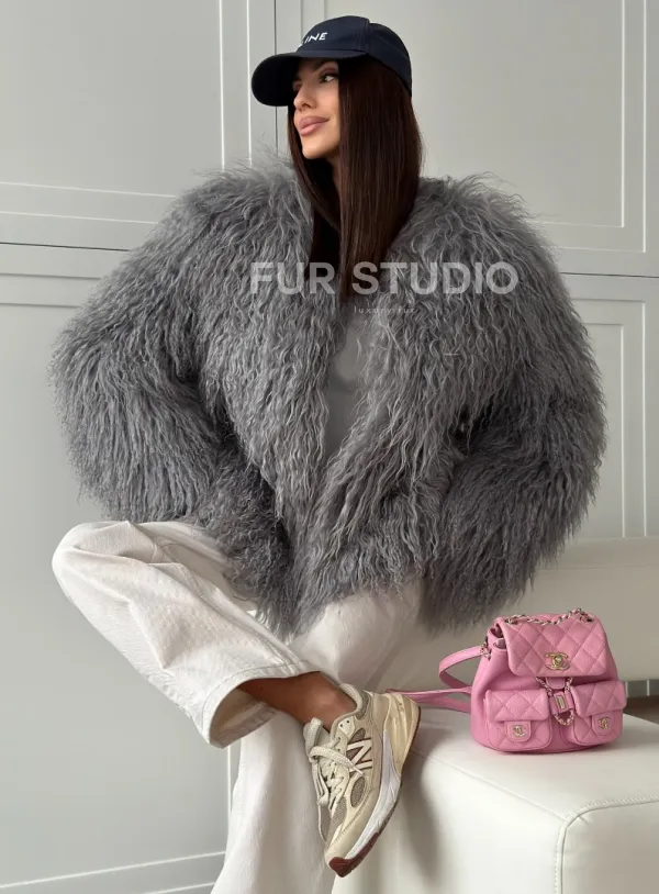 Серая шуба из натурального меха ламы 102811