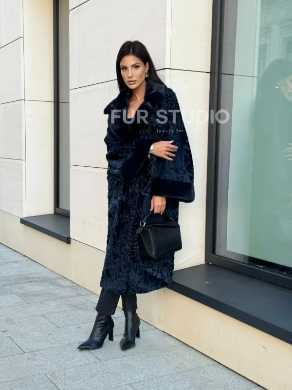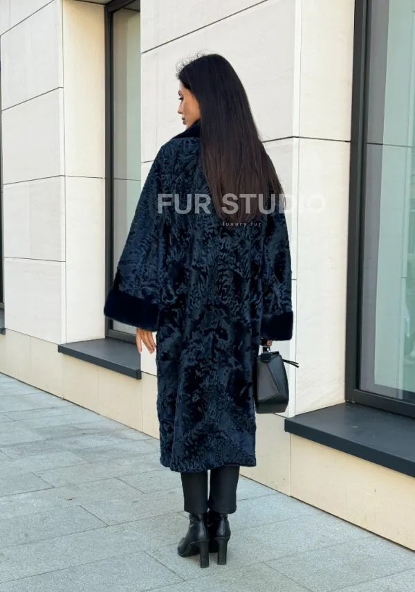 Шуба из каракуля Indigo Blue с отделкой из меха норки, фасон кокон 101105