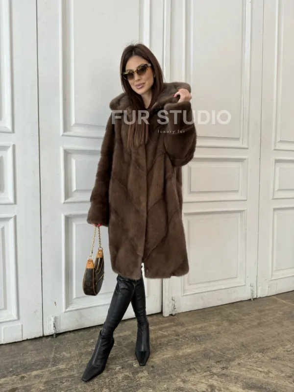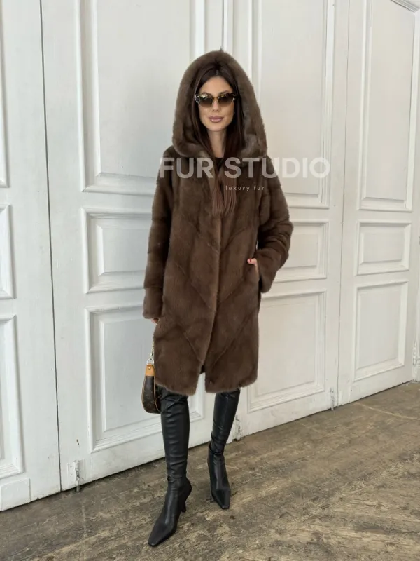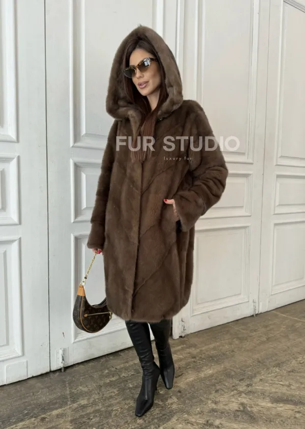 Шуба из меха норки с капюшоном в цвете орех 100875