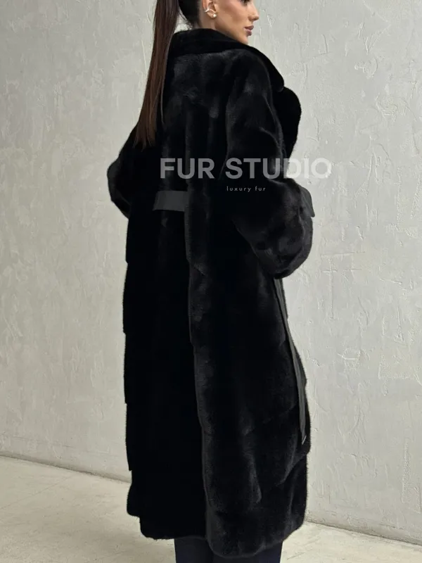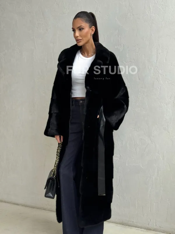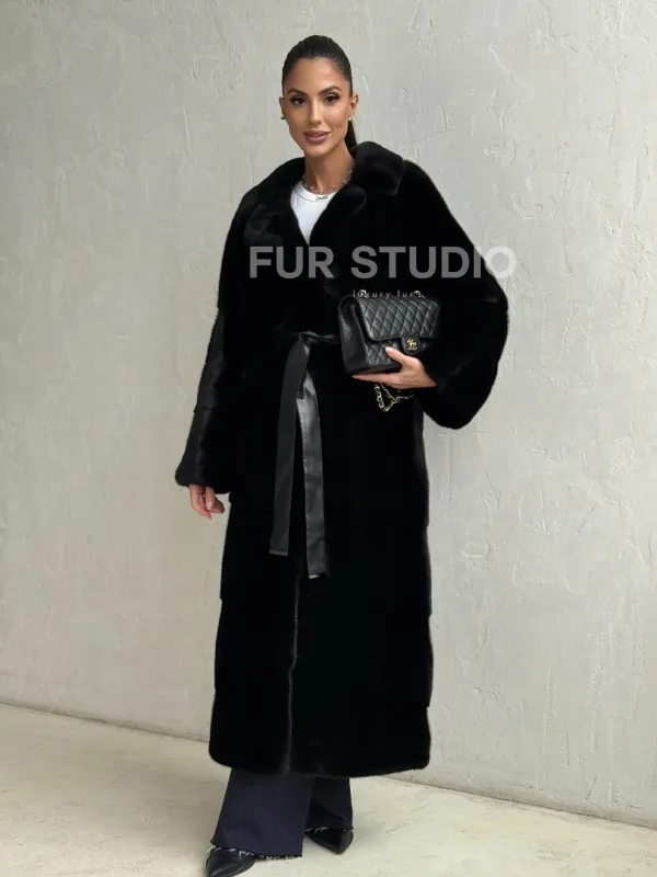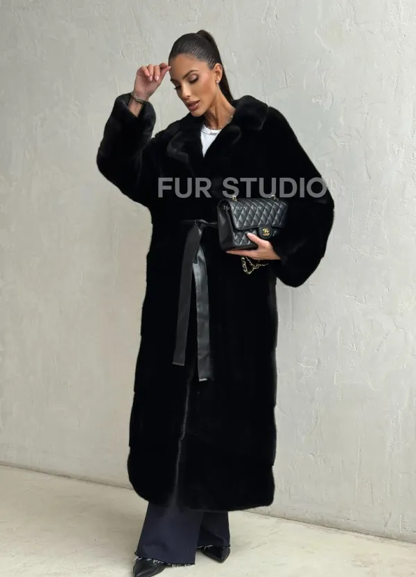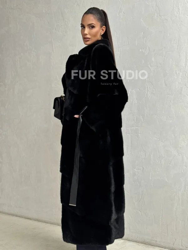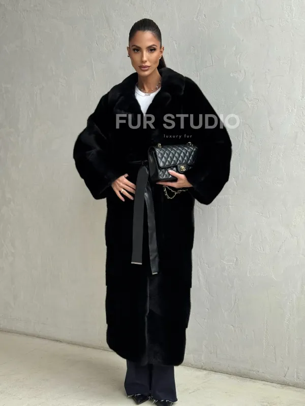 Удлиненная черная шуба с поясом из скандинавской норки – отличное решение для стильных и уверенных женщин, которые знают что хотят. Модель выглядит роскошно, и в ней вы будете собирать восхищенные взгляды. Комфортная длина бережно защитит владелицу в любую непогоду. Меховой пояс выгодно очертит талию. Прямой крой поможет скрыть недостатки фигуры. Изделие подходит девушкам любого возраста и типа фигуры.